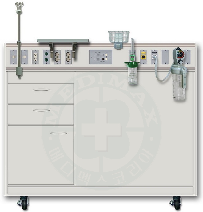 - Este sistema es para la educación en enfermería y reconstruye la consola instalada en la parte superior de la pared en el lado de la cama ofreciendo energía eléctrica y gas médico para el tratamiento de los pacientes.